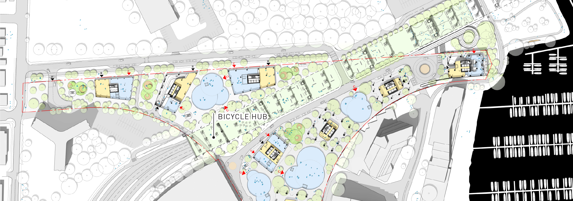 While the current transportation infrastructure prioritizes north-south arterial axis, the new density from Sen̓áḵw presents the possibility of improving transverse connectivity through the revitalization of the streetcar line, upgraded aqua bus and ferry services, and enhanced cycling options.