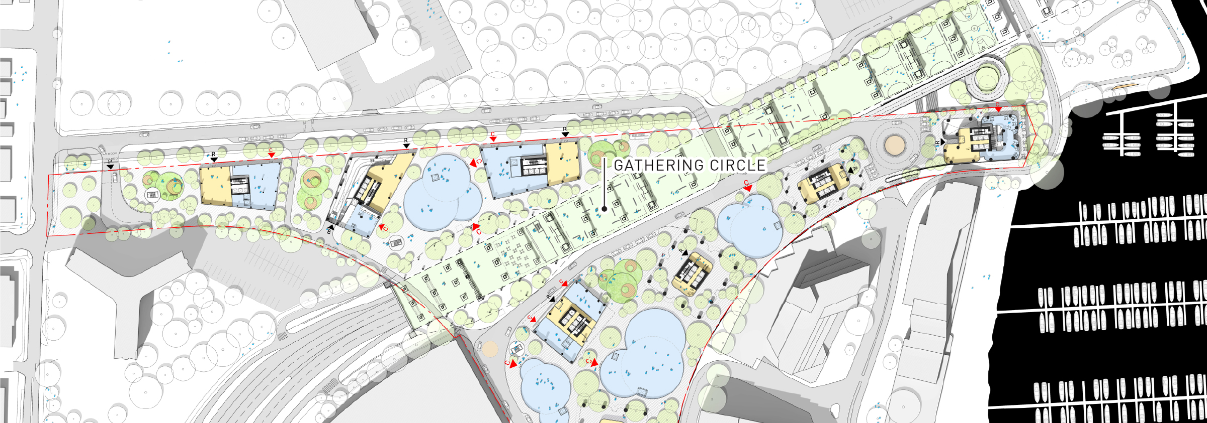 In celebration of the Land and the homecoming of the Squamish Nation on their reclaimed territory, Sen̓áḵw is envisioned with a re-imagined ‘Towers in the Park’ approach. Bright, open courtyards, liberated ground plane, rich and vibrant multi-tiered landscape for social spaces, commercial and recreational activity, and artistic interventions that seek to enrich the natural and cultural contexts of the site